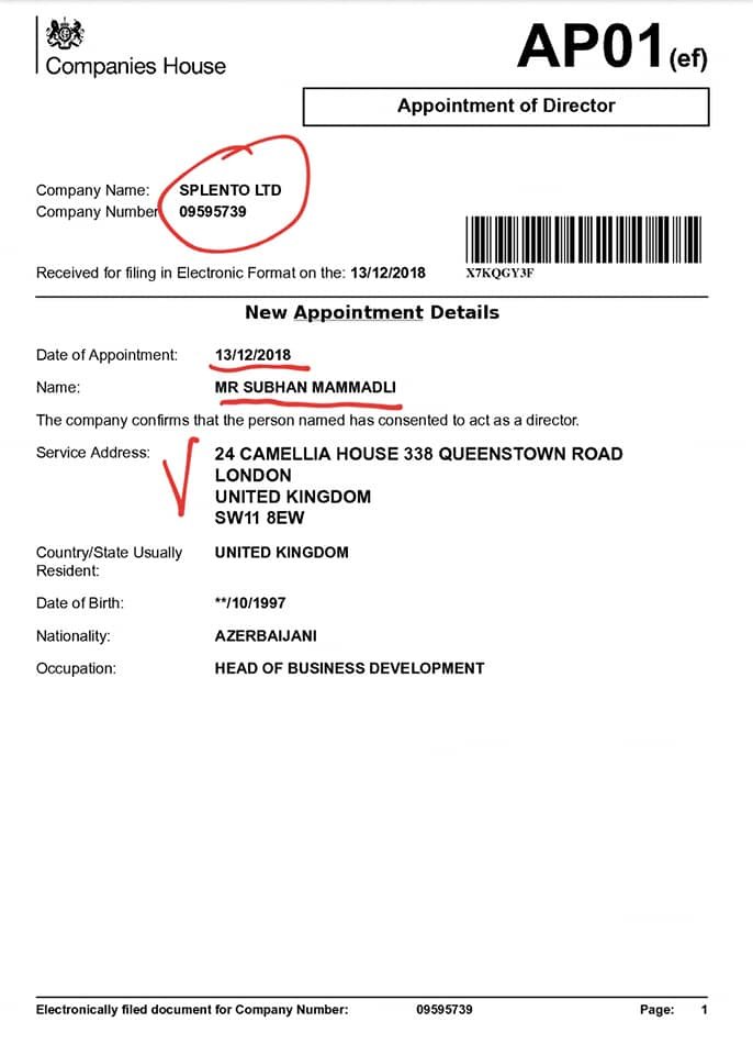 Britaniya ədliyyəsinə aid reyestr sənədlərinə görə, 1997-ci il təvəllüdlü Sübhan Məmmədli 2018-ci ilin dekabrın 13-də Londonda fəaliyyət göstərən SPLENTO LTD şirkətinin hissələrini alır və şirkətə şəriklik hüququ əldə edir. 18 may 2015-ci ildən fotoqrafiya sahəsində fəaliyyət göstərən şirkət (q eydiyyat nömrəsi 09595739) Londonun mərkəzində, Air Street 20 ünvanında yerləşir.